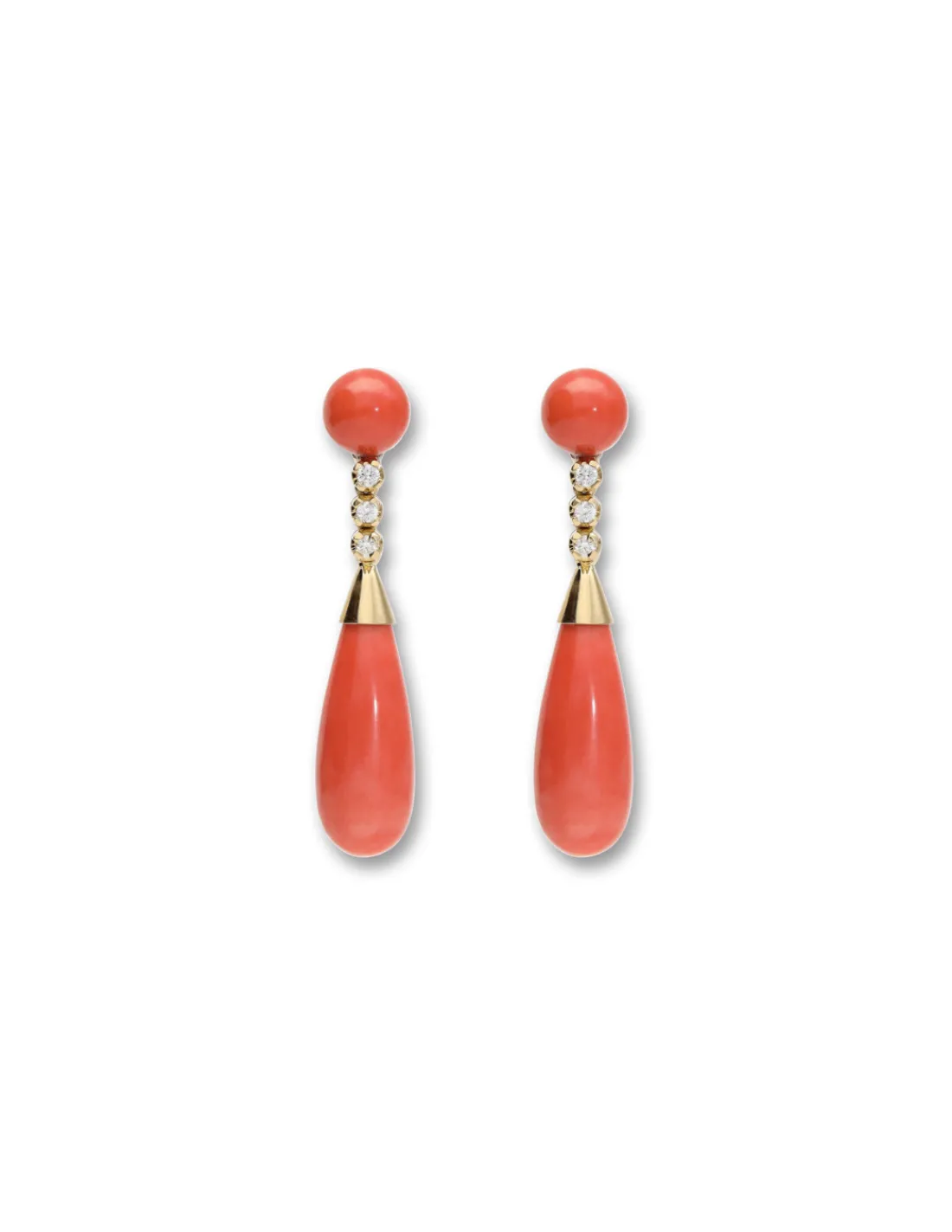 Pendientes de oro amarillo 1ª Ley (750 mmas) con botón de coral japonés y diamantes de los que cuelga una elegante lágrima de coral.
