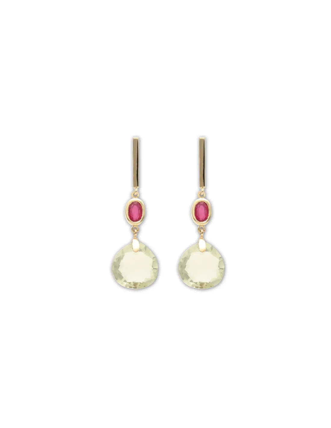 Pendientes de oro amarillo 9 kt (375 mmas) con rubí oval y amatista verde talla pera briolette. Esta pieza permite combinar y lucir en cualquier ocasión.