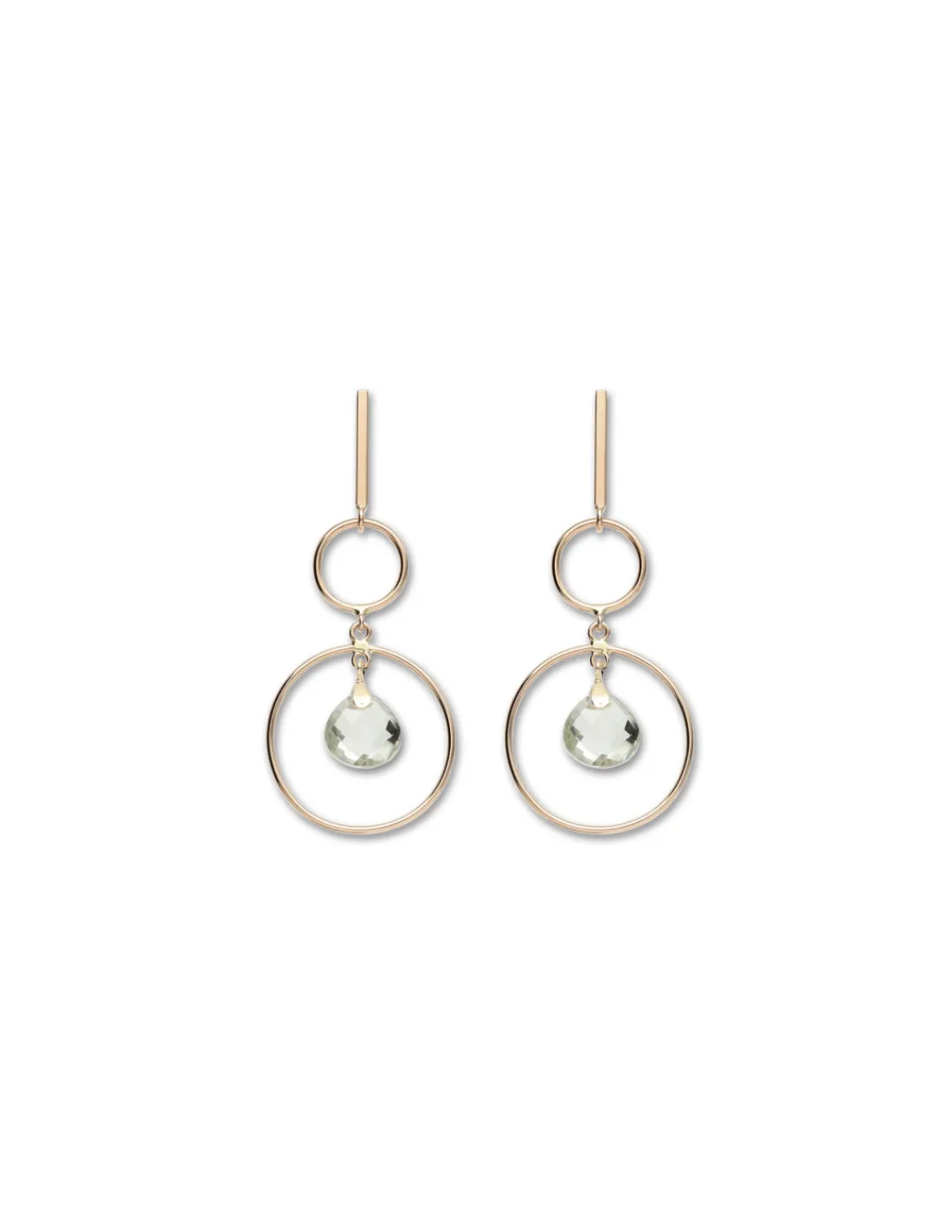 Pendientes de oro amarillo 9 kt (375 mmas) con barra rígida de la que cuelgan dos aros y a su vez una amatista verde talla pera briolette.
