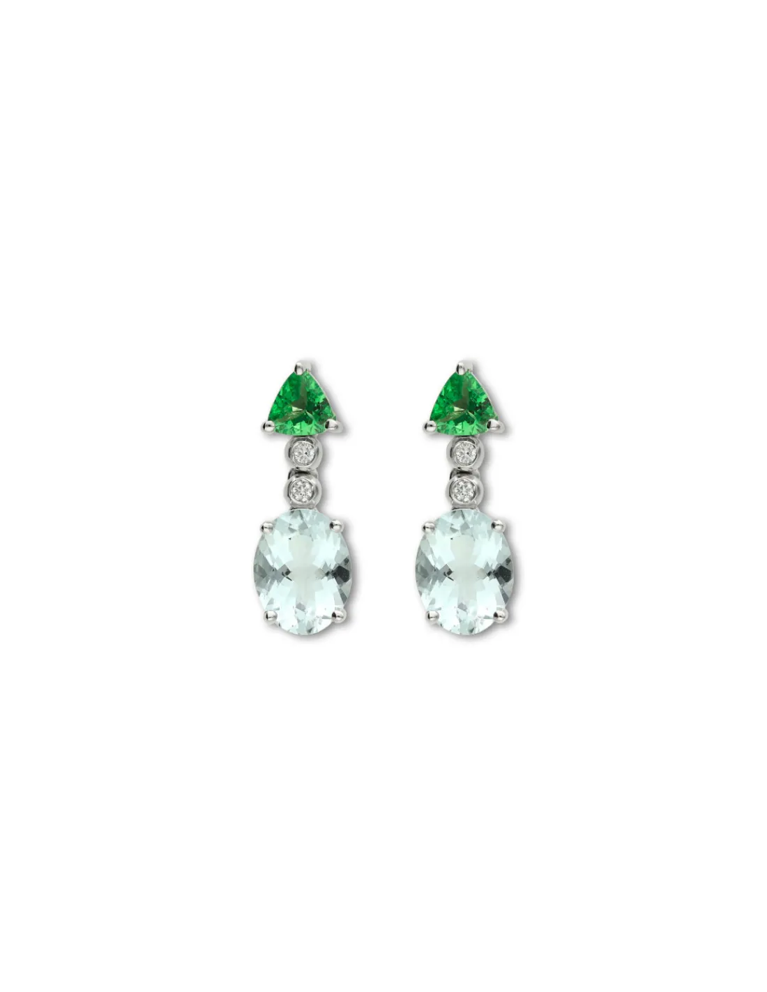 Pendientes de oro blanco 1ª Ley (750 mmas) con tsavorita triangular de la que cuelgan dos diamantes talla brillante y a su vez una elegante aguamarina talla oval. Una joya fina con color que aporta elegancia y modernidad.