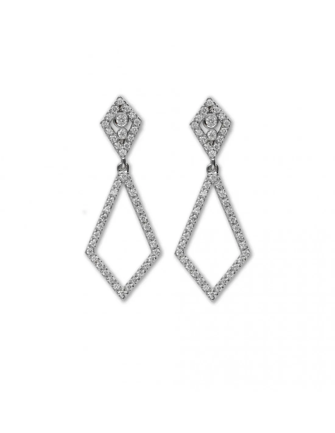 Pendientes de oro blanco 1º Ley (750 mmas) con diamantes naturales engastados en garritas y en boquilla. La parte de arriba forma un pequeño rombo y la de abajo la silueta del rombo engastada de diamantes. Ideal para novias. Largo (3,2 cm).