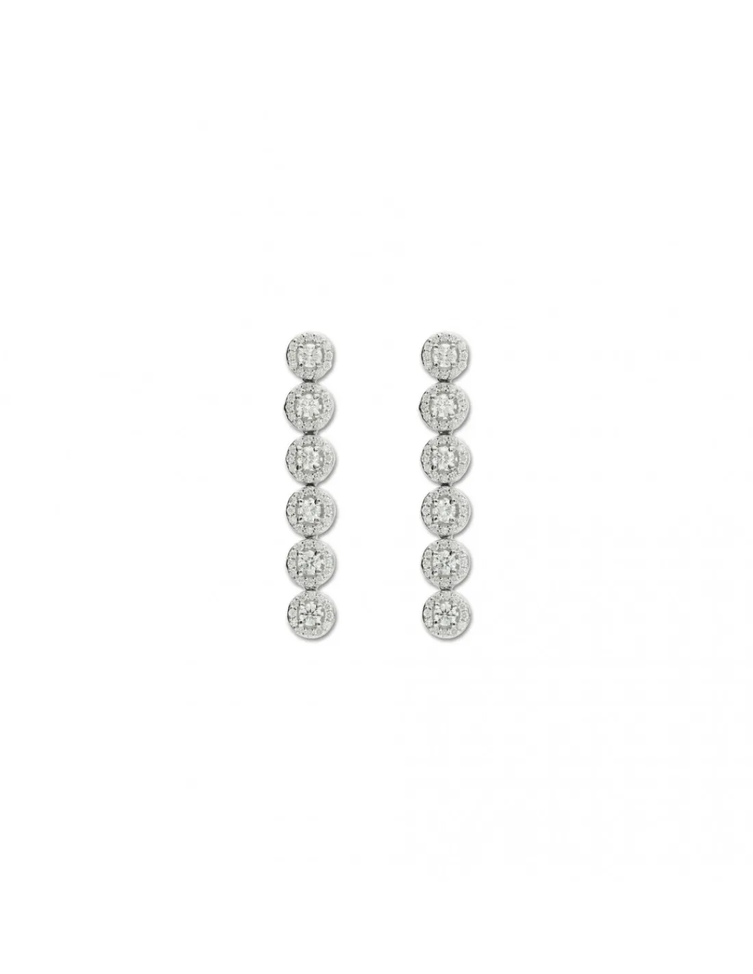 Pendientes de oro blanco 1ª Ley (750 mmas) compuesto por varias orlas de diamantes en el centro talla brillante engastado en garras rodeados por orlas de diamantes talla brillante engastados en grano. Un pendiente con movimiento y luz para novia e invitada. Cierre de palillo y presión. Largo aproximado 4 cm.