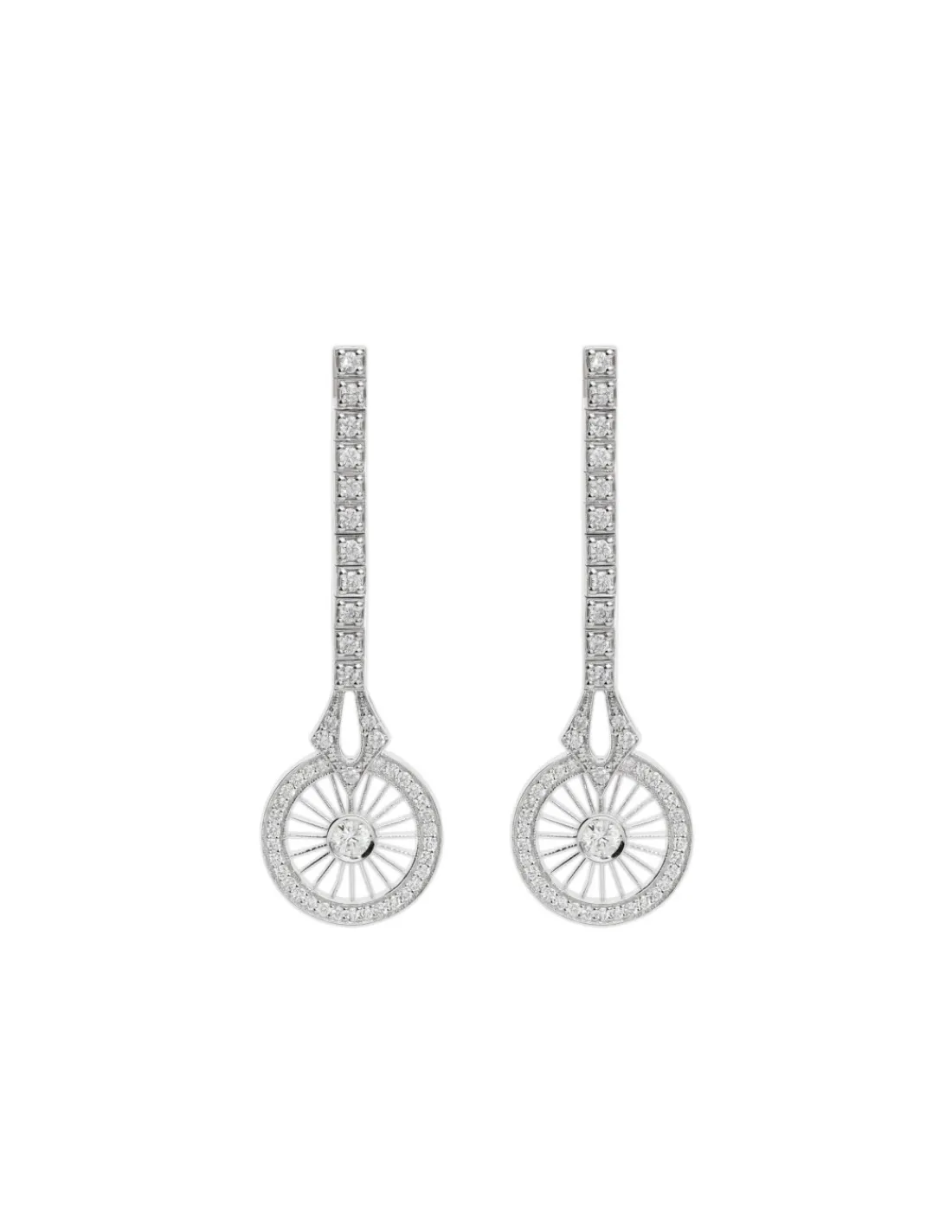 Pendientes de oro blanco 1ª Ley (750 mmas) con barra y orla de diamantes talla brillante. Una joya para novias o invitadas que aporta luz y movimiento.