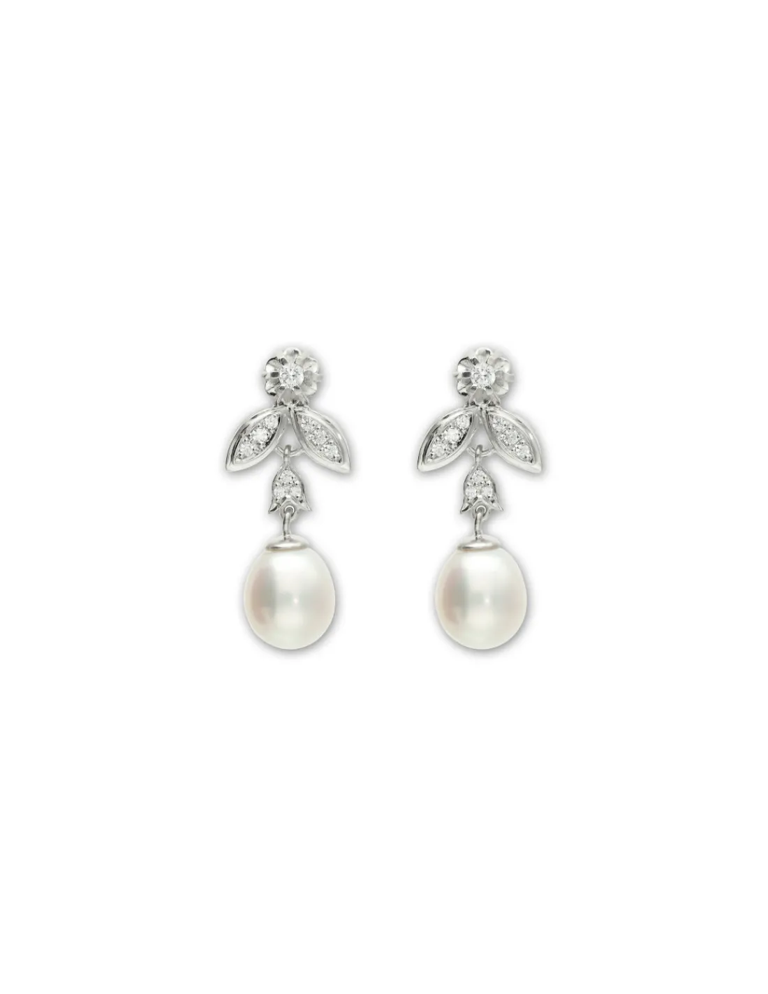 Pendientes de plata 1ª Ley (925 mmas) con diseño de flor y hojas con circonitas engastadas de las que cuelga una perla de agua dulce. Un pendiente ideal para novias e invitadas.