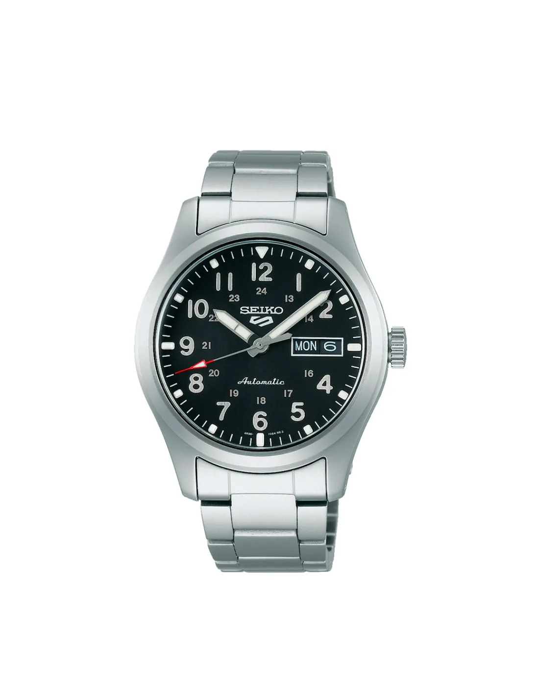 Reloj Seiko 5 Sports Field Military para hombre con caja de acero de 39,4 mm, esfera negra con números árabes y brazalete de acero. Movimiento automático con 41 horas de reserva de marcha. Sumergible 100 metros.
