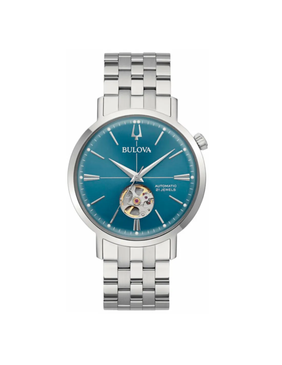 Reloj Bulova Aerojet Automatic para hombre con caja de acero de 41 mm, esfera color azul con fondo transparente con movimiento a la vista y cristal mineral combinado con brazalete de acero. Movimiento automático.