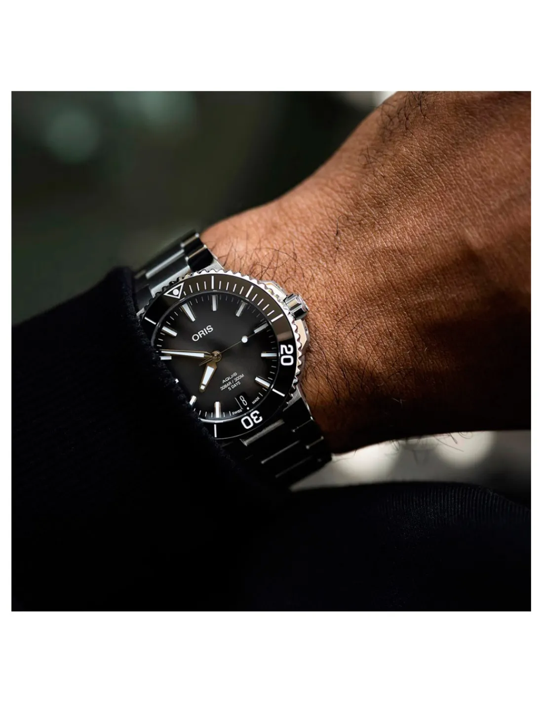 Reloj Oris Aquis Date Calibre 400 unisex con caja de acero de de 41,5 mm de diámetro, escala minutera cerámica, esfera gris con índices y agujas Superluminova, cristal de zafiro antirreflejos con ambas caras abombadas combinado con brazalete de acero. Movimiento automático Swiss Made y 120 horas de reserva de marcha .