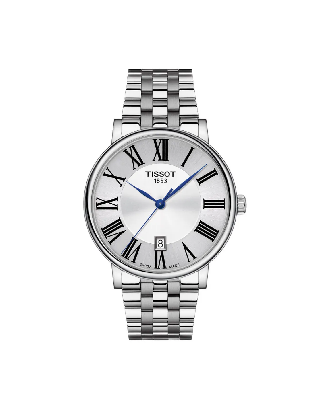 Reloj Tissot Carson con caja de acero de 40 mm, esfera plateada y agujas en azul, brazalete de acero. Movimiento de cuarzo fabricado en Suiza. Una pieza elegante y atemporal que te viste en los momentos más importantes.