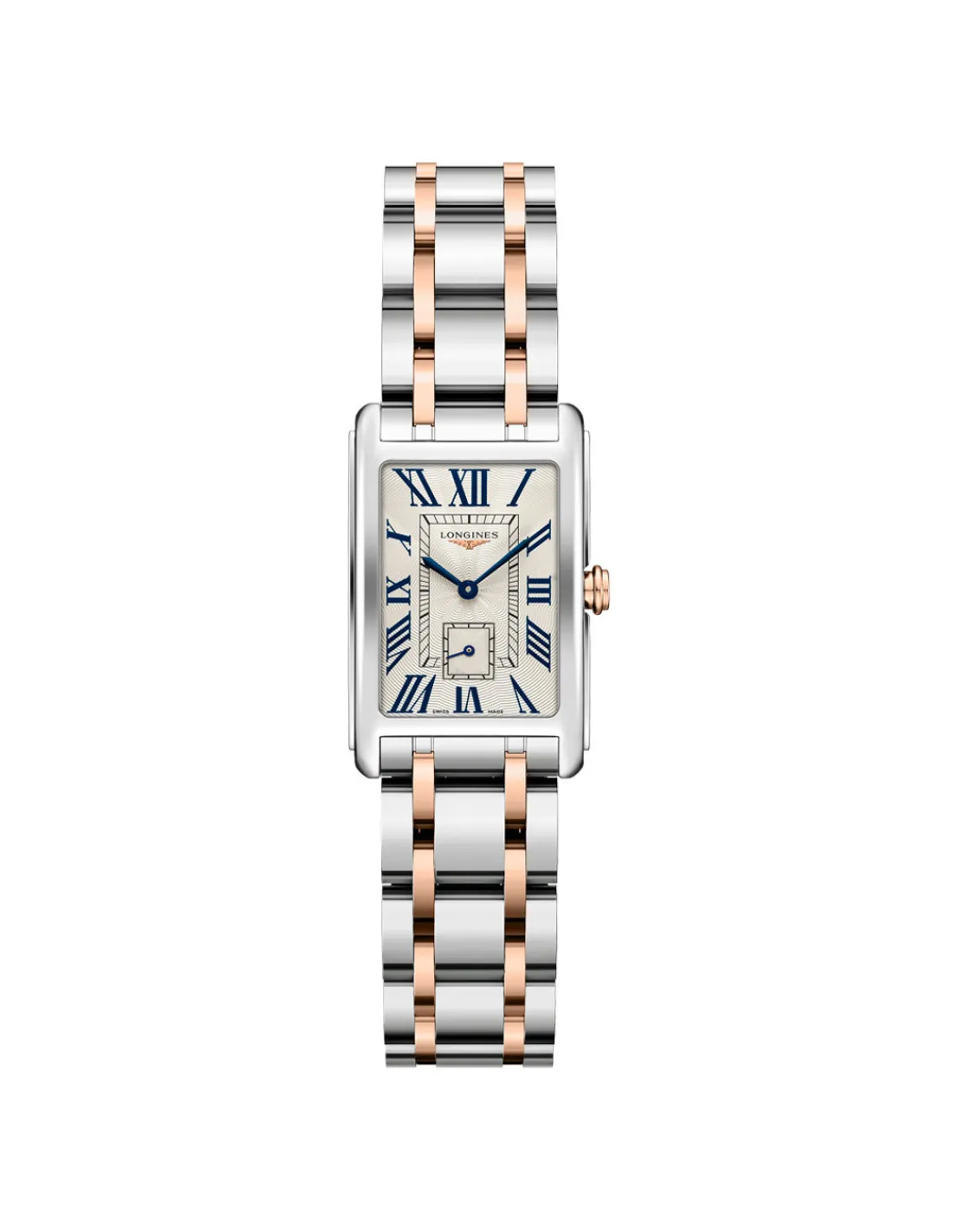 Reloj Longines DolceVita para mujer con caja de acero de 32×20 mm y corona de oro rosa de 18 kt, esfera blanca e índices romanos en azul que combina brazalete de acero y láminas de oro rosa. Movimiento de cuarzo Swiss Made.