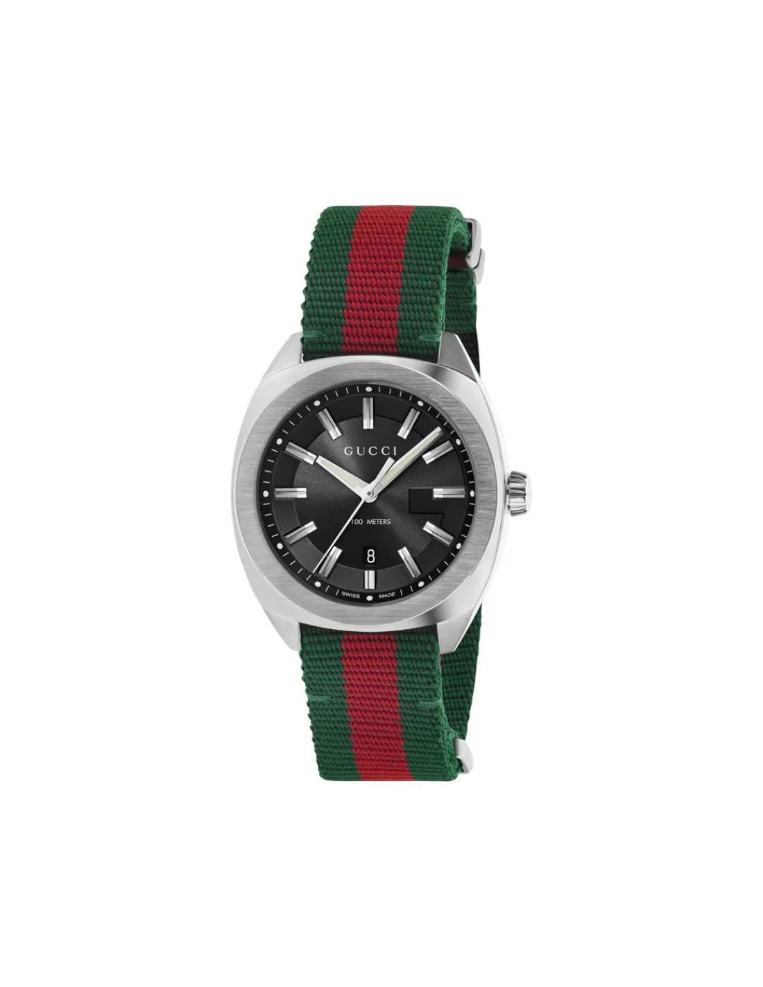 Reloj Gucci GG2570 YA142305 para hombre con caja geométrica de acero con esfera negra y correa de nylon verde y rojo. Movimiento de cuarzo Swiss Made.