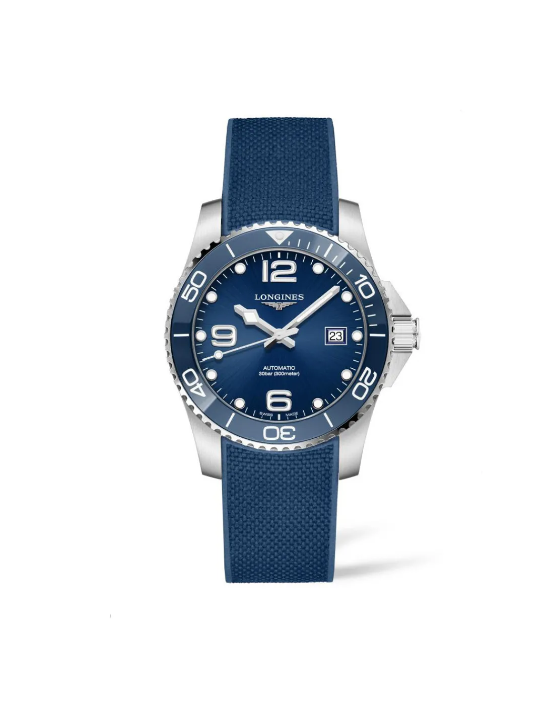 Reloj Longines HydroConquest con movimiento automático, caja de acero de 41 mm de diámetro, esfera y correa de cacucho azul. Un reloj clásico y elegante.