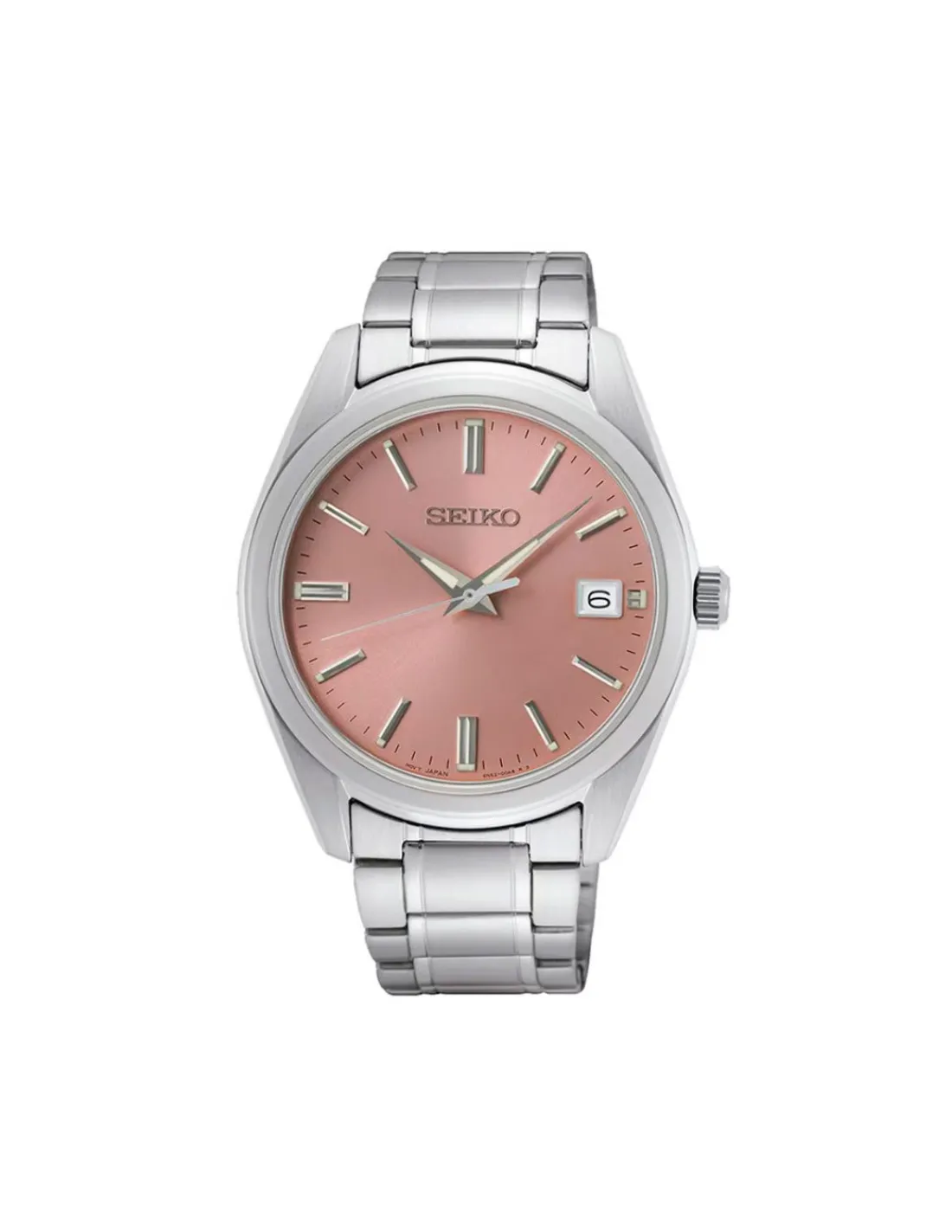Reloj Seiko Neo Classic para hombre con caja de acero de 40,2 mm de diámetro, esfera rosa y cristal de zafiro combinado con brazalete de acero. Movimiento de cuarzo japonés.