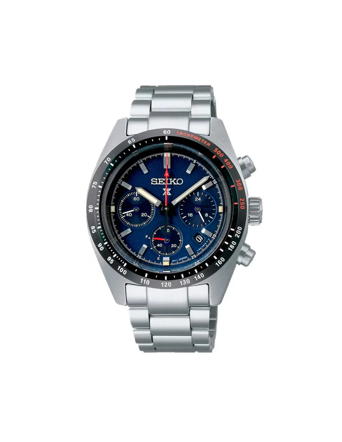 Reloj Seiko Prospex Speedtimer Cronógrafo para hombre con caja de acero inoxidable de 39 mm, esfera azul con índices y agujas lumibrite, cristal de zafiro curvado, revestimiento antirreflectante en la superficie interna combinado con brazalete de acero. Movimiento solar japonés calibre V192 con una duración de 6 meses aproximadamente.