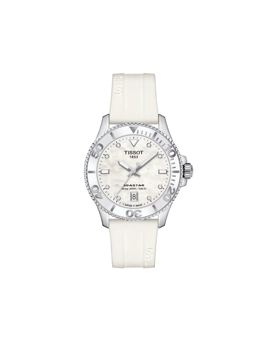 Reloj Tissot Seastar 10000 con caja de acero de 36 mm de diámetro, esfera blanca con ocho diamantes como índices VS-SI de 0.0456 ct y agujas luminiscentes combinado con correa de silicona color blanco. Un reloj elegante y a la vez con estilo deportivo que te acompañará en el día a día. Movimiento de cuarzo Swiss Made.