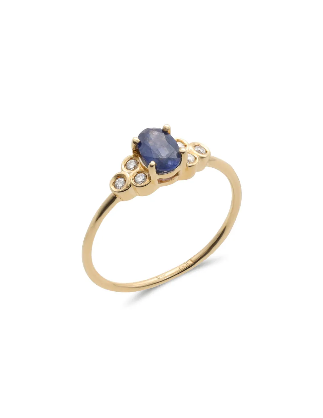 Anillo de oro amarillo 9 kt (375 mmas) con zafiro oval y diamantes talla brillante. Una joya para el día a día con un diseño que aporta sencillez y originalidad.