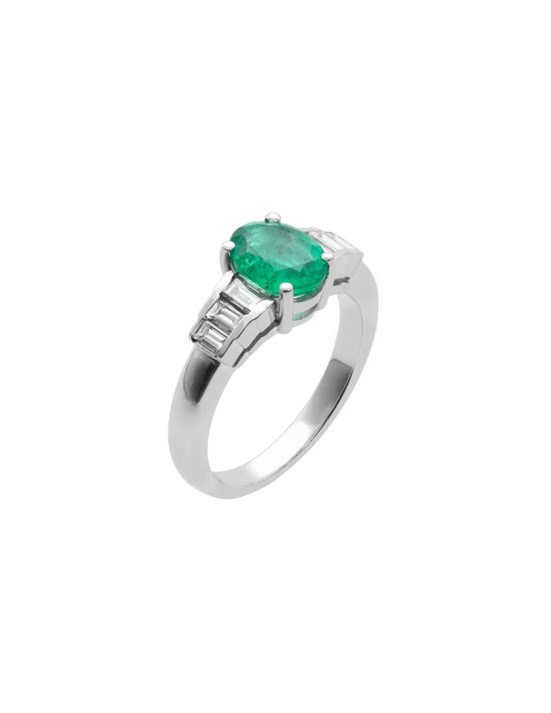 Anillo de oro blanco 1ª Ley (750 mmas) con esmeralda central oval, diamantes talla baguette a los laterales y desmontable de oro blanco con diamantes. Una joya muy versátil que puedes usar en cualquier ocasión gracias a su opción desmontable. Perfecta para pedida de mano.