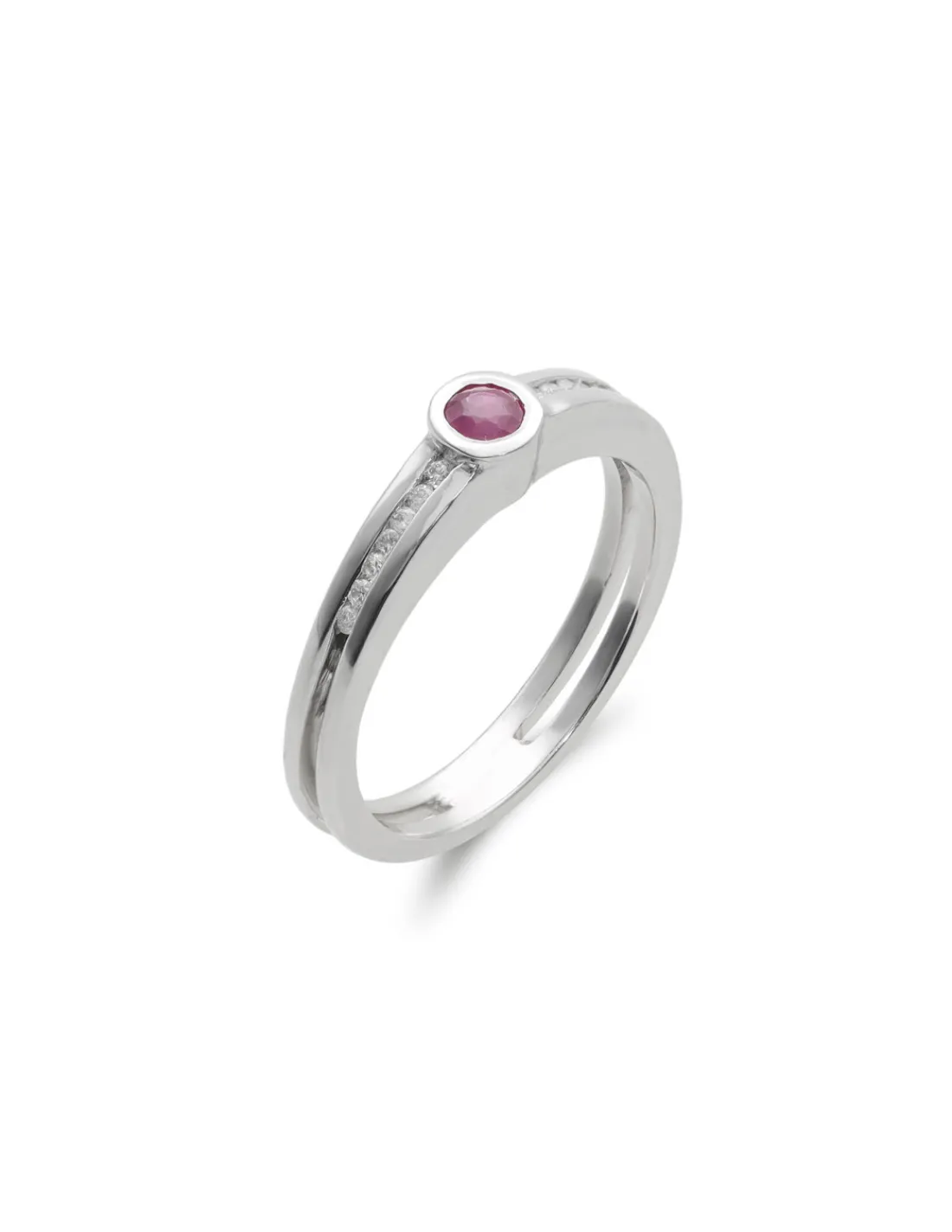 Anillo de oro blanco 9 kt (375 mmas) con rubí engastado en boquilla y diamantes engastados en carril. Talla 13.