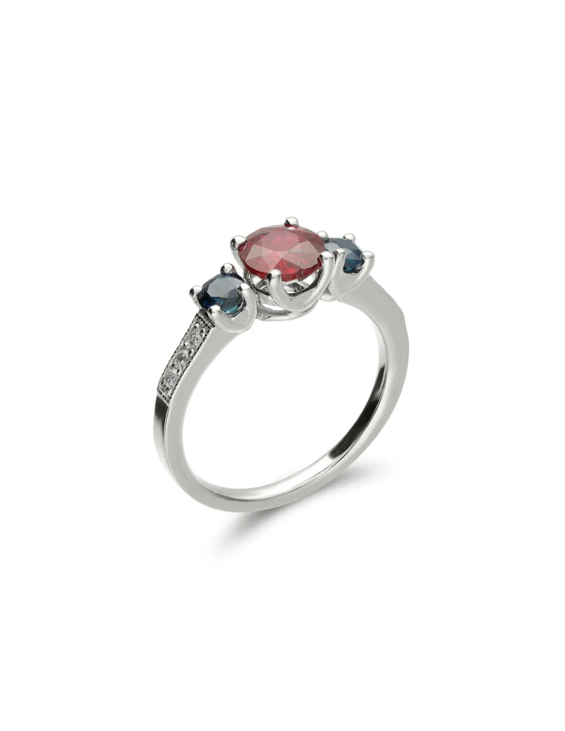 Anillo de oro blanco 1ª Ley (750 mmas) con rubí redondo en el centro acompañado de zafiros a cada lado y diamantes talla brillante en los laterales del aro. Una joya exuberante y llamativa ideal para día y para noche.