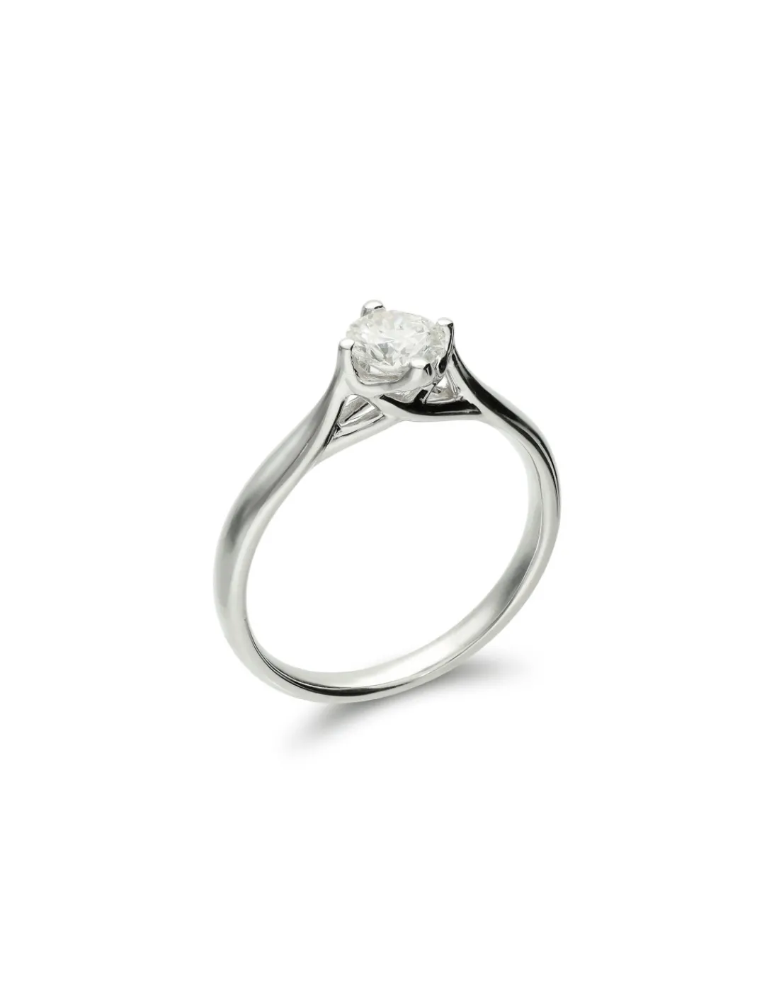 Anillo-Solitario de oro blanco 1ª Ley (750 mmas) con diamante talla brillante. Elegancia atemporal de oro y diamante, una joya para toda la vida.