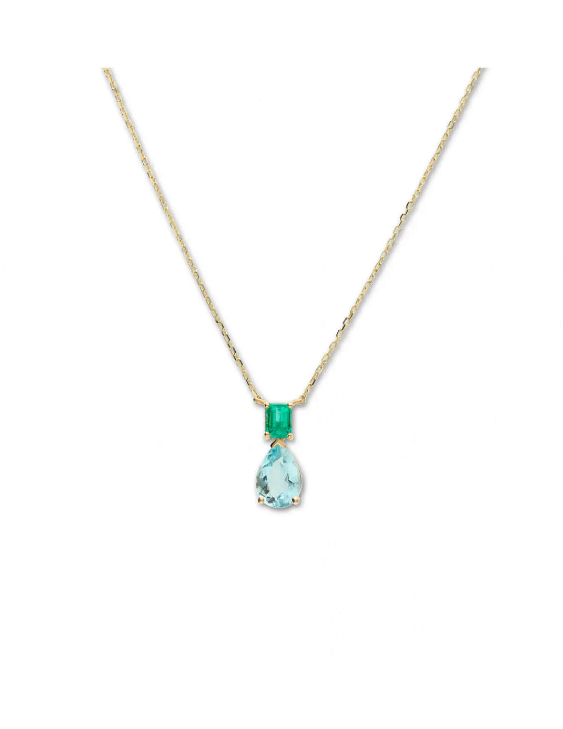 Gargantilla de oro amarillo 1ª Ley (750 mmas) compuesta por cadena engarzada con colgante de oro amarillo que combina esmeralda talla esmeralda con aguamarina talla pera. Una joya elegante para cualquier evento o para el día a día. Largo total 40 cm.