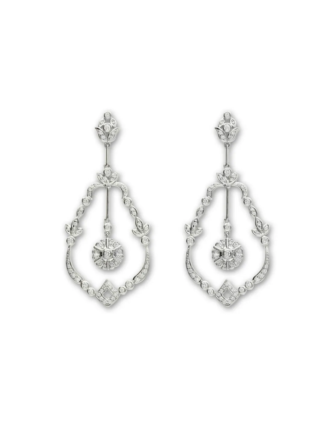 Pendientes de oro blanco 1ª Ley (750 mmas) con diamantes talla brillante engastados en grano y en boquilla. Una joya con un aspecto de distinción, elegancia y gran luminosidad.