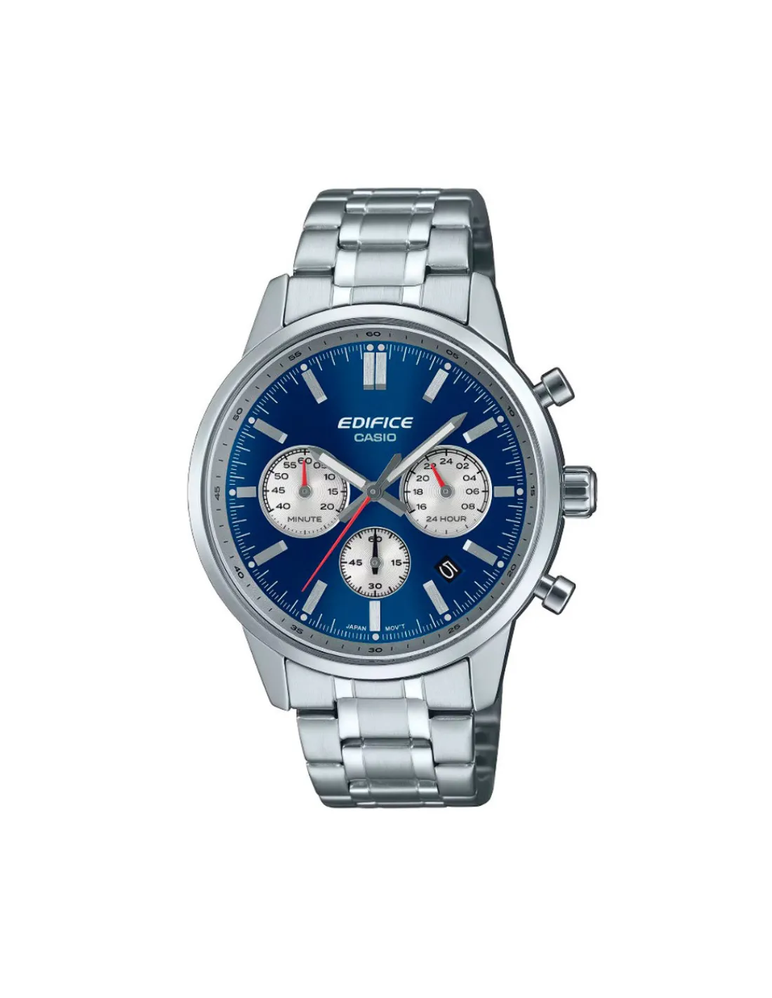 Reloj Casio Edifice con caja de acero inoxidable de 40,5 mm de diámetro, esfera bicolor azul y blanco, cristal mineral esférico combinado con brazalete de acero. Duración aproximada de la batería: 2 años en SR920SW. Movimiento de cuarzo japonés.