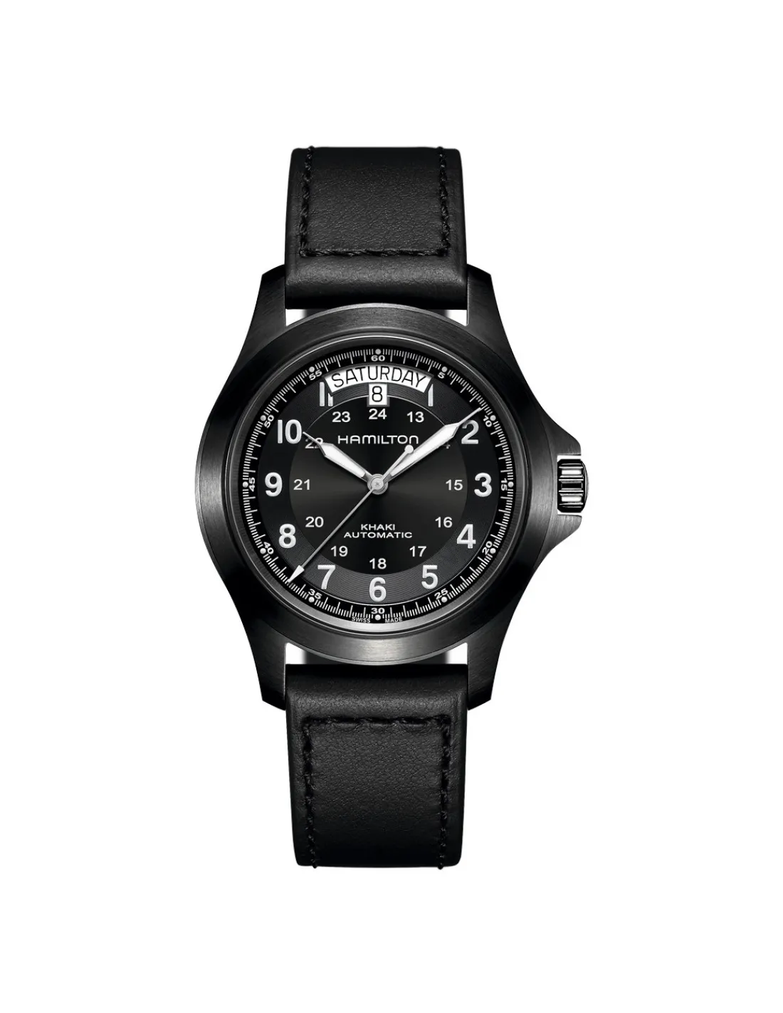 Reloj Hamilton Khaki Field con caja de acero y revestimiento de PVD negro, esfera negra con números romanos color blanco y correa de piel negra. Inspirado en el legado militar de Hamilton, un reloj robusto y resistente con movimiento automático Swiss Made y 42 horas de reserva de marcha.