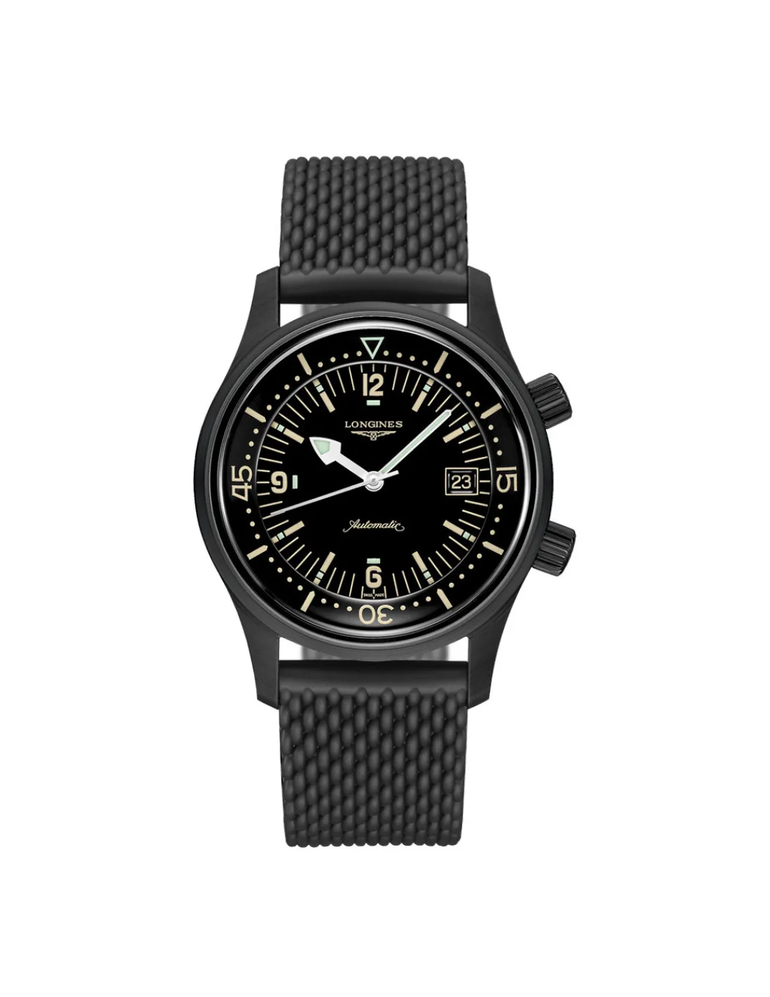 Reloj Longines Legend Diver L3.774.2.50.9 con caja de acero PVD negro de 42 mm, esfera negra y correa de caucho negro. Movimiento automático Swiss Made con reserva de marcha de 64 horas.
