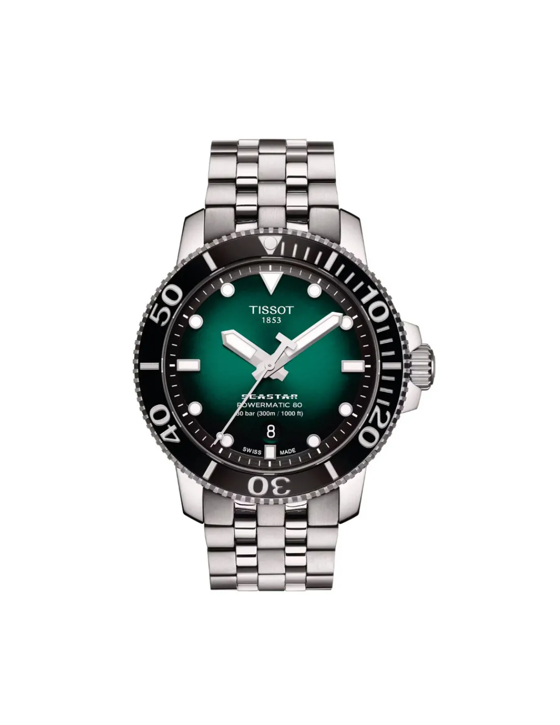 Reloj Tissot Seastar 1000 Powermatic 80 para hombre con caja de acero inoxidable de 43 mm de diámetro, esfera color gradiente verde con índices aplicados Superluminova, bisel de cerámica, cristal de zafiro resistente a los arañazos combinado con brazalete. Movimiento automático Swiss Made y 80 horas de reserva de marcha.