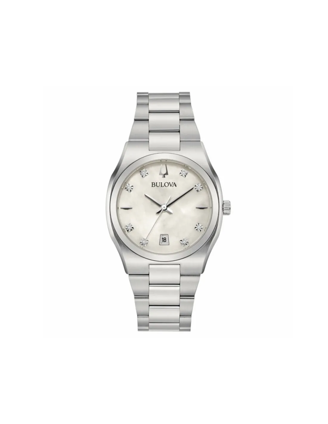 Reloj Bulova Surveyor Lady con caja de acero de 34 mm, esfera color madreperla con índices finos y elegantes con ocho diamantes engastados y cristal mineral combinado con brazalete de acero. Movimiento de cuarzo.