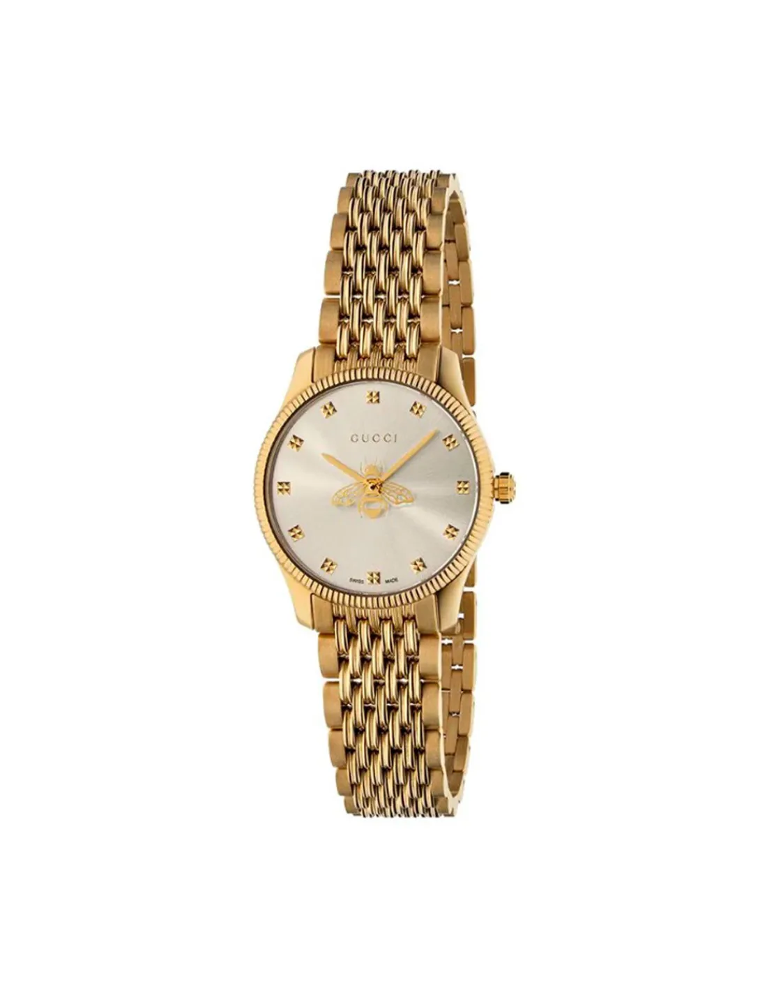 Reloj Gucci Timeless para mujer con caja de PVD en oro amarillo de 29 mm, esfera plateada satinada con abeja como segundero y correa de eslabones de PVD en oro amarillo. Movimiento de cuarzo Swiss Made.