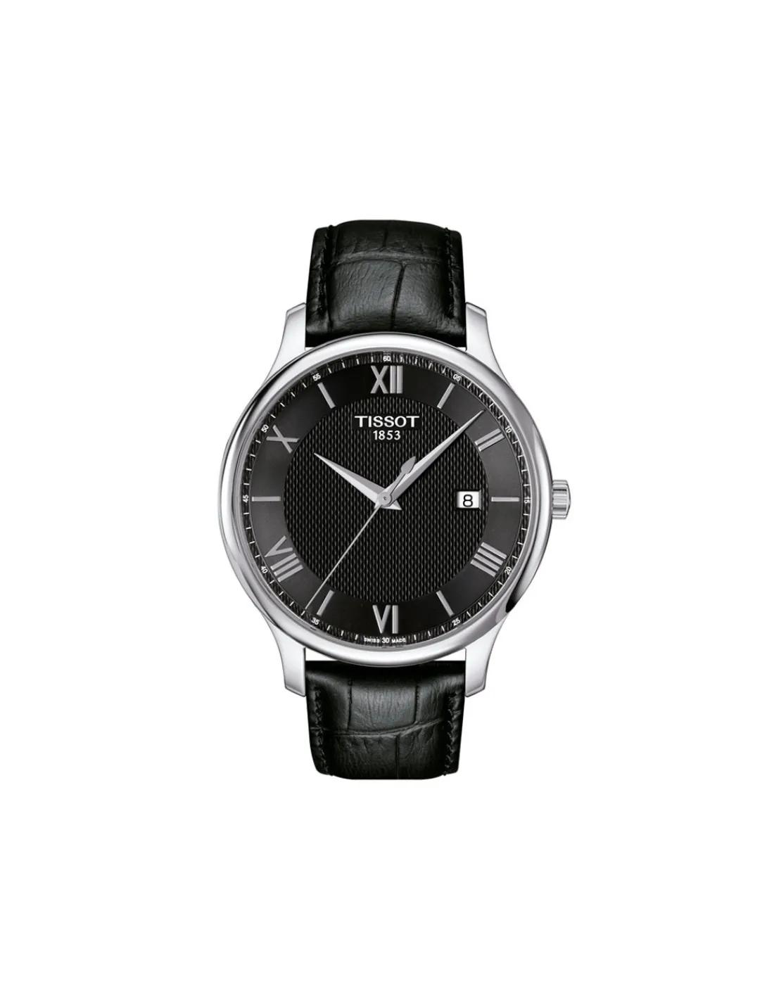 Reloj Tissot Tradition T063.610.16.058.00 para hombre con caja de acero, elegante esfera negra y correa de piel negra imitación caimán. Movimiento de cuarzo Swiss Made.