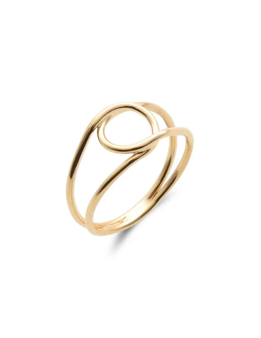 Anillo de oro amarillo 1ª Ley (750 mmas) diseñado a partir de líneas que forman dos aros cruzados.