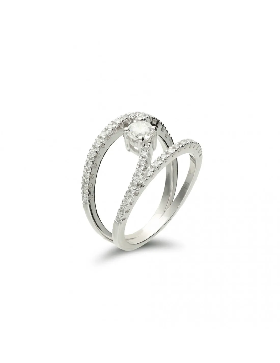 Anillo de oro blanco 1ª Ley (750 mmas) con doble aro engastado con diamantes separado por un diamante talle brillante en el centro creando una joya de un estilo único y original. Talla 12.