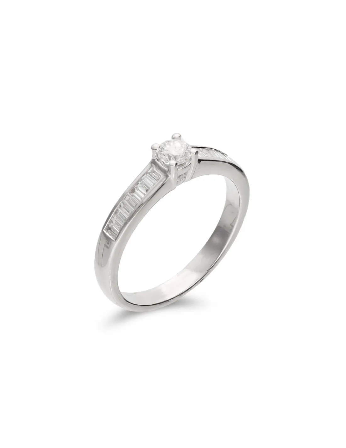 Anillo de oro blanco 1ª Ley (750 mmas) con un diamante natural talla brillante engastado en cuatro garras y diamantes talla baguette en el aro. Talla 12.