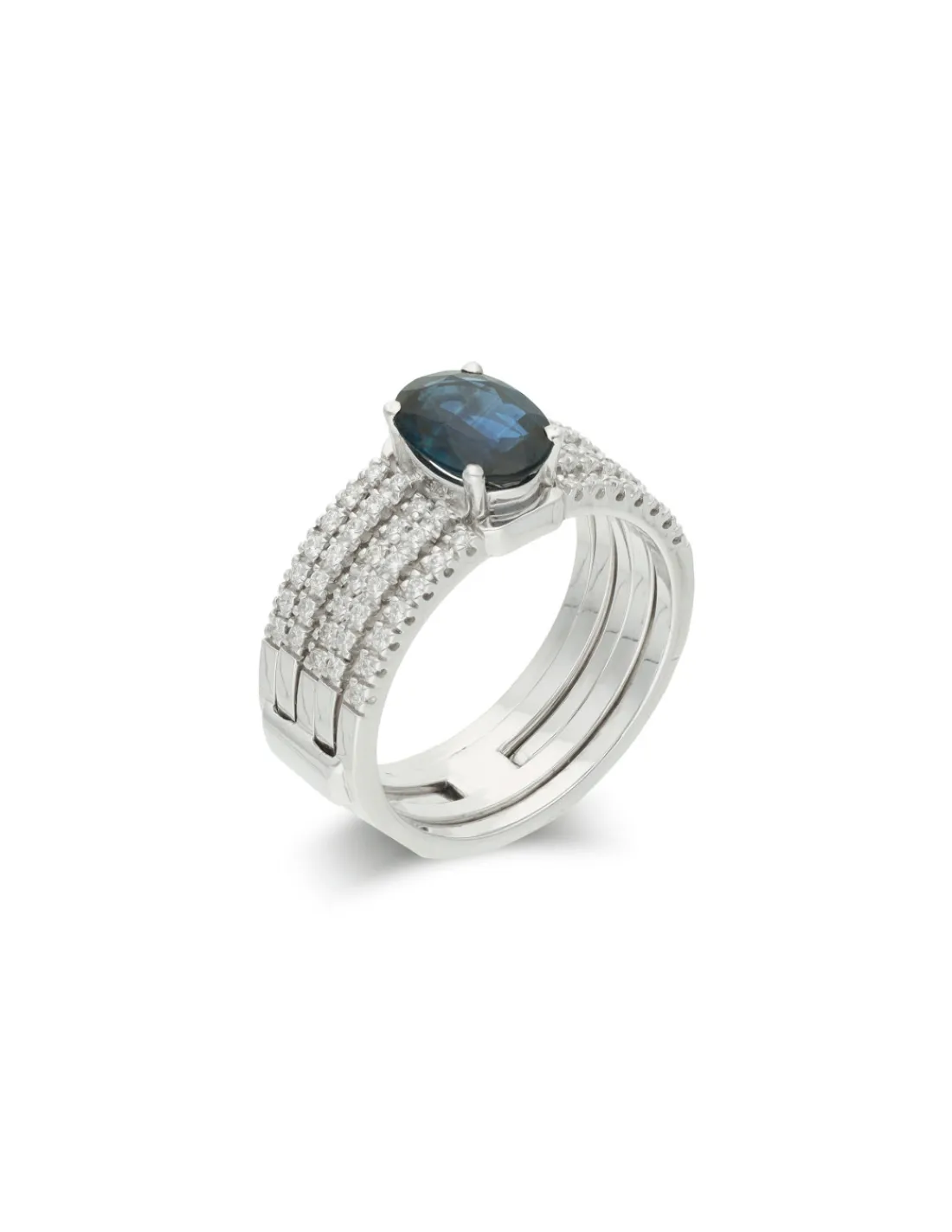 Anillo de oro blanco 1ª Ley (750 mmas) con zafiro central oval, diamantes en los laterales y desmontable de oro blanco con diamantes. Una joya muy versátil que puedes usar en cualquier ocasión gracias a su opción desmontable. Perfecta para pedida de mano.