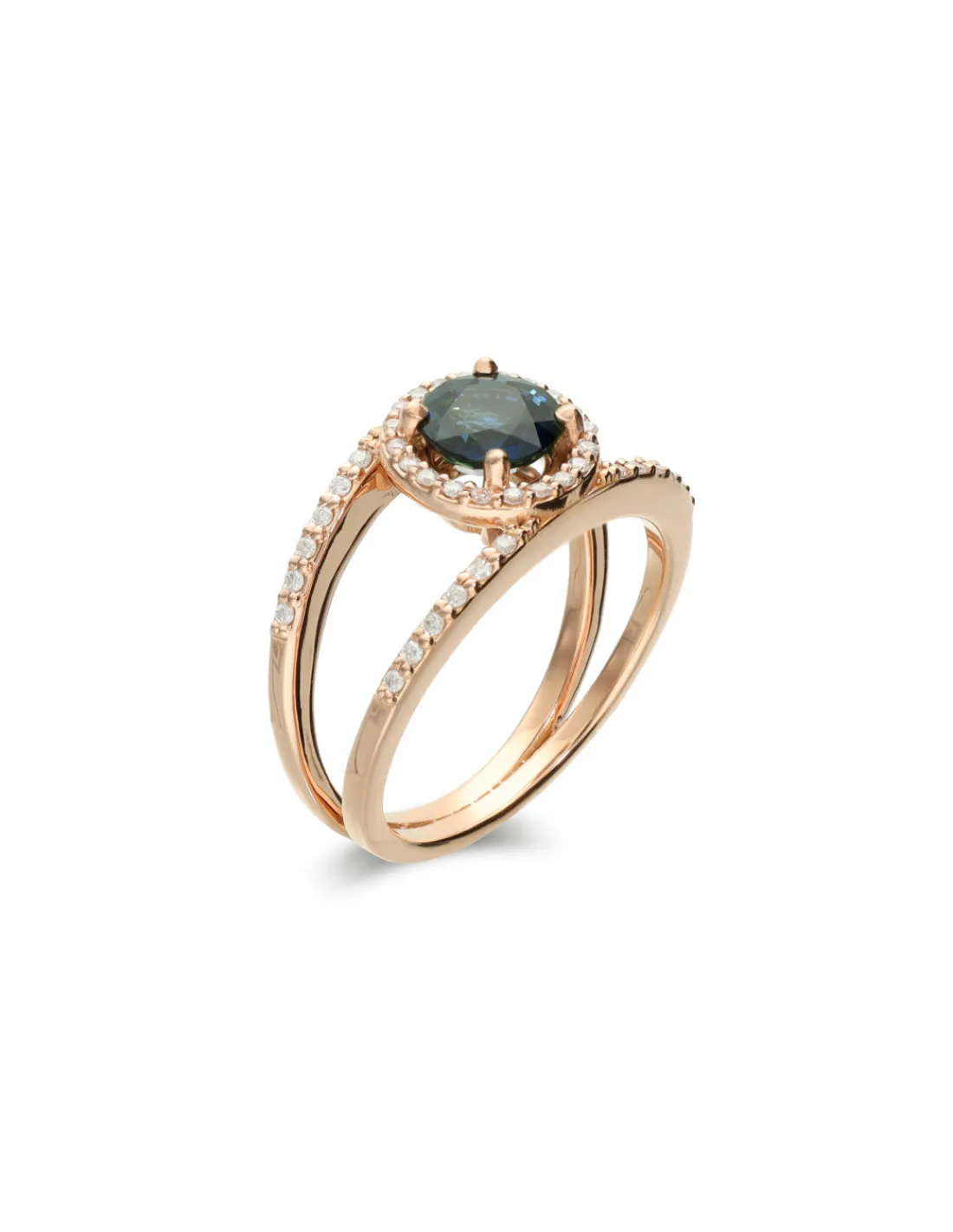 Anillo de oro rosa 1ª ley (750 mmas) con doble aro que combina zafiro redondo en el centro rodeado por una orla de diamantes y en parte del aro. Una joya única y especial. Talla 15.