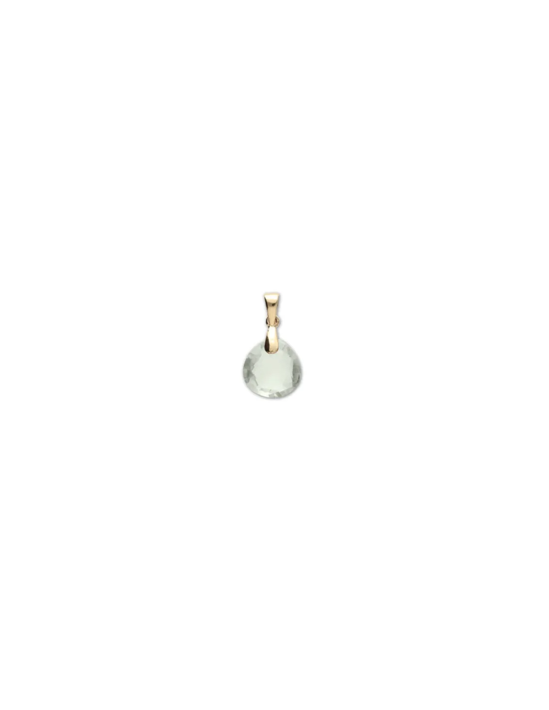Colgante de oro amarillo 9 kt (375 mmas) con amatista verde talla pera briolette. Tamaño aproximado incluyendo asa y reasa 1,7 cm.