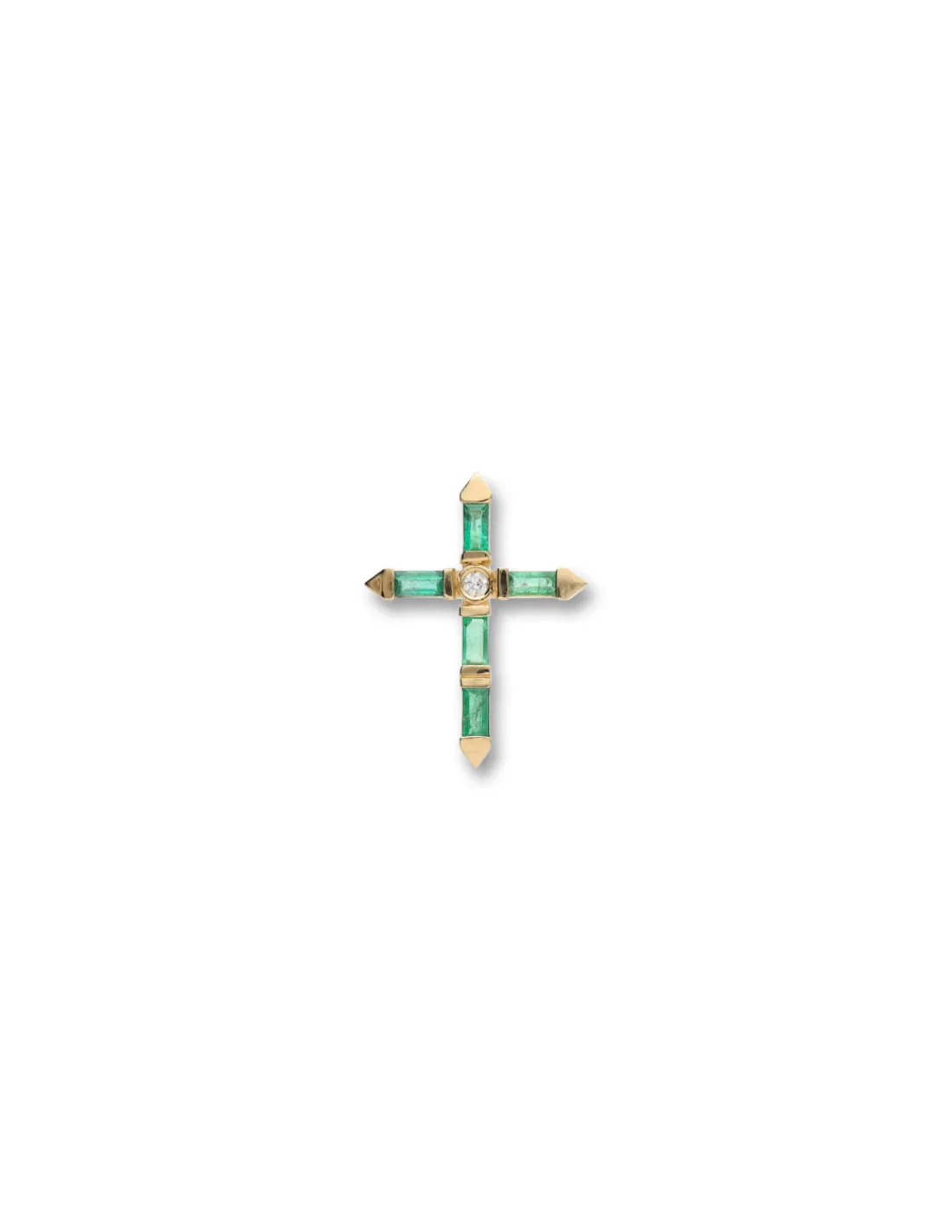 Cruz de oro amarillo 1ª Ley (750 mmas) con diamante talla brillante en el centro acompañado de esmeraldas talla baguette. Tamaño aproximado 2,3 cm.