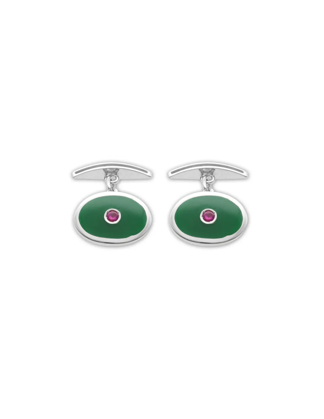Gemelos de plata 1ª Ley (925 mmas) ovalados con esmalte verde y rubí sintético.