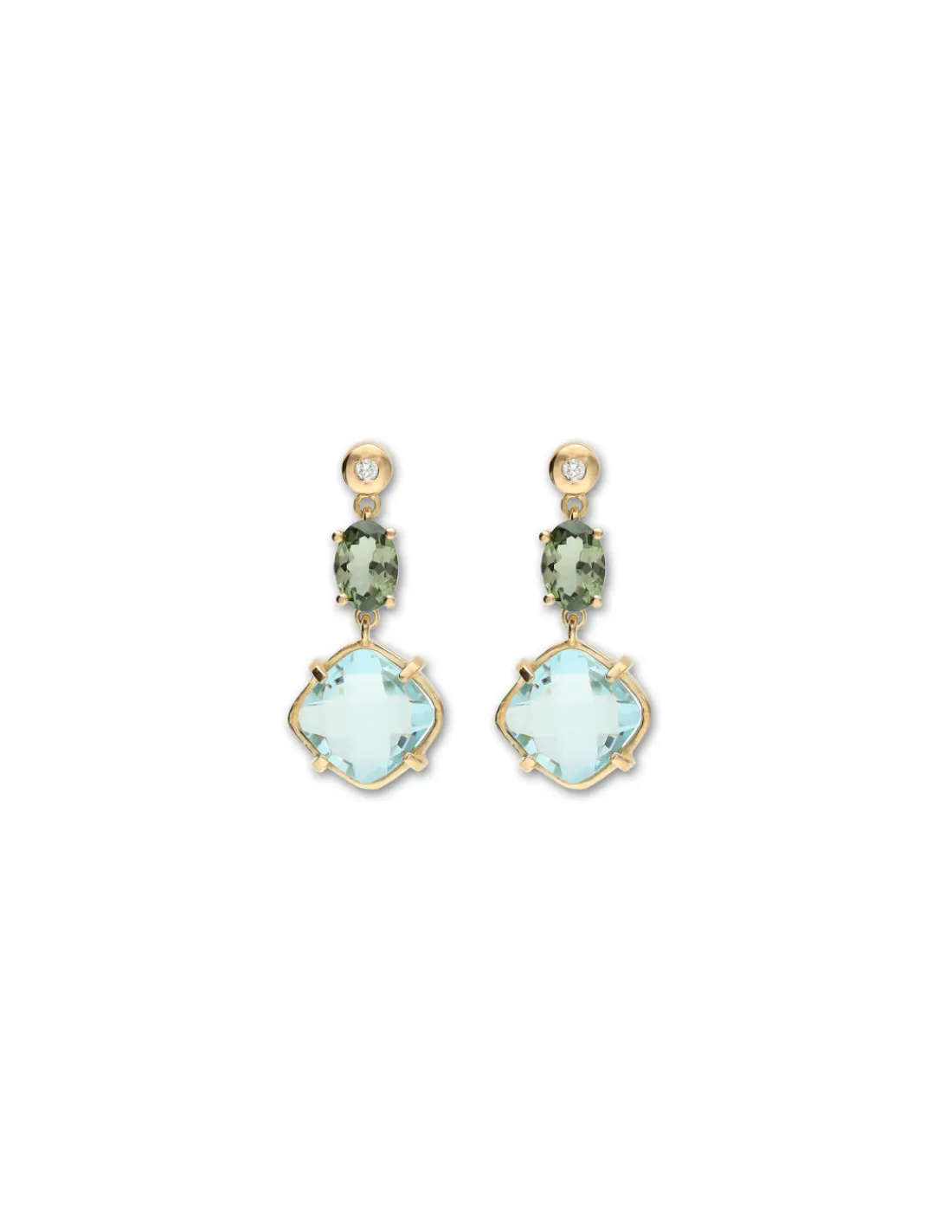 Pendientes de oro amarillo 1ª Ley (750 mmas) con chatón y diamante engastado acompañado de una turmalina oval y un topacio azul briolette.