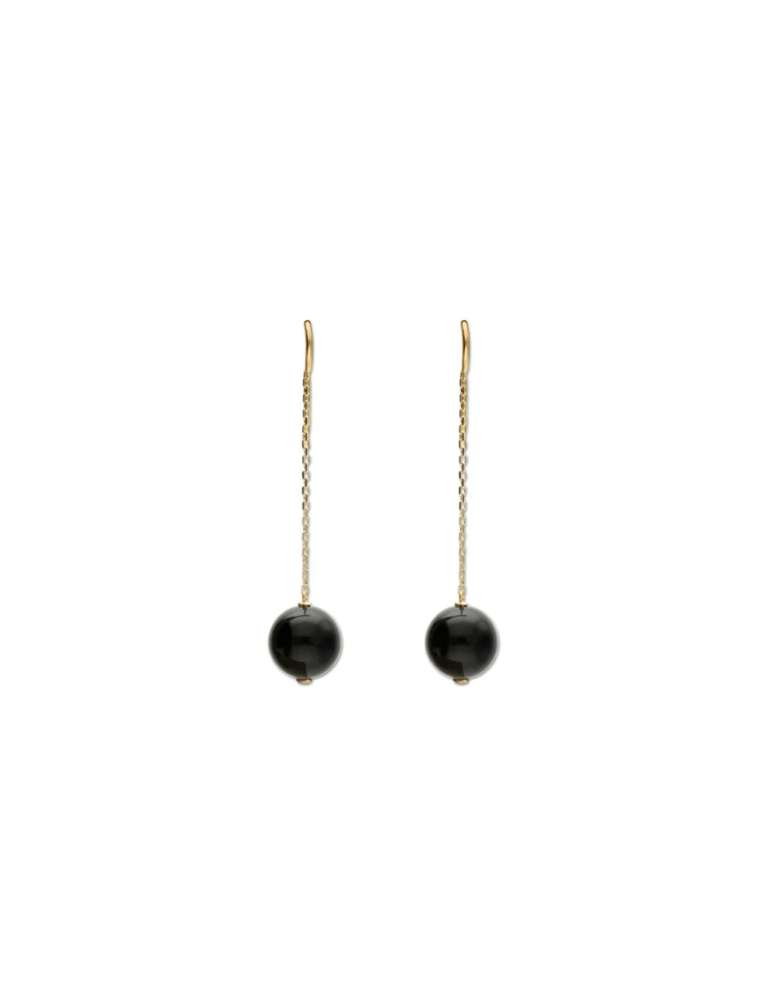 Pendientes de oro amarillo 1ª Ley (750 mmas) con cadena de la que cuelga una bola de ónix. Una joya minimalista que se adapta a cualquier estilo y aporta a cualquier look un toque único y especial.