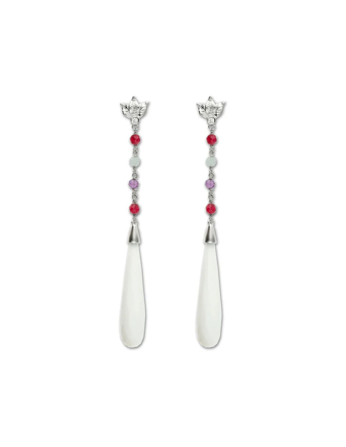 Pendientes de plata 1ª Ley (925 mmas) con hoja y circonita engastada, amatista, aguamarina y jade rojo combinados con una perilla de ágata blanca facetada. Una joya elegante y original.