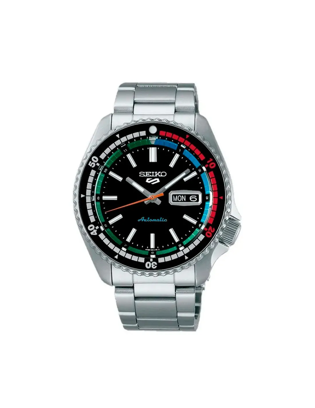 Reloj Seiko 5 Sports Skx Style Edición Especial para hombre con caja de acero inoxidable de 42,5 mm de diámetro, bisel giratorio unidireccional, esfera negra con Lumibrite en agujas, índices y bisel, cristal de Hardlex curvado y brazalete de acero. Calibre 4R36. Movimiento automático con 41 horas de reserva de marcha aproximadamente.