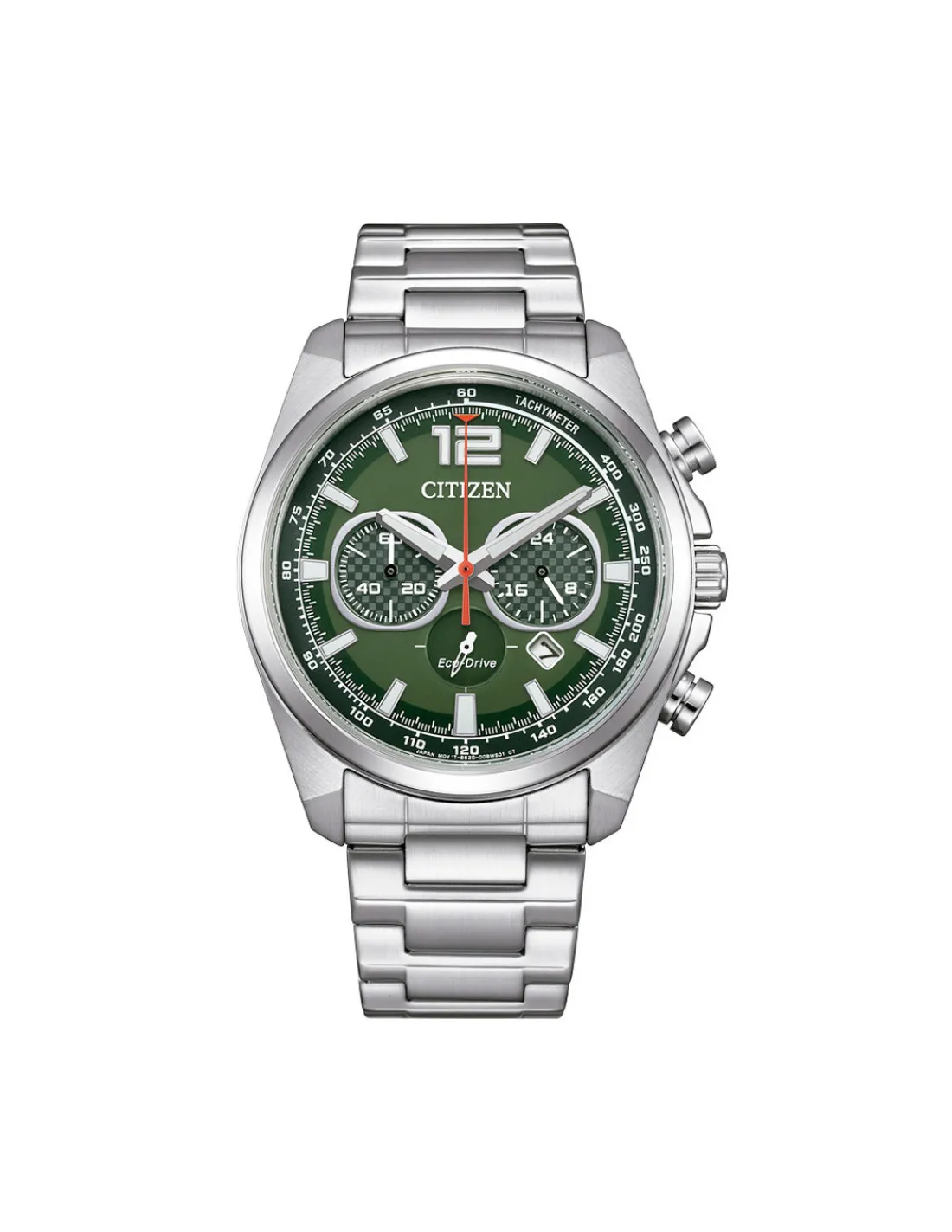 Reloj Citizen Active Sport Chrono con caja de acero inoxidable de 41 mm de diámetro, esfera verde con agujas y marcas con luminous, cristal mineral y brazalete de acero. Movimiento Eco Drive B620 con reserva de carga 9 meses.