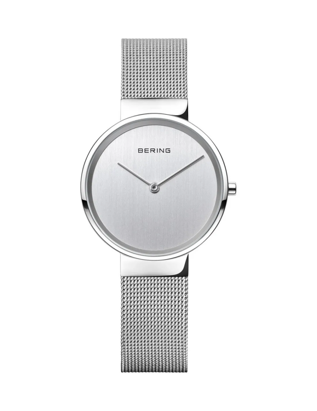Reloj Bering Classic para mujercon caja redonda de 31 mm, esfera plateada y malla milanesa. Movimiento de cuarzo. Un reloj sencillo con diseño Danés.