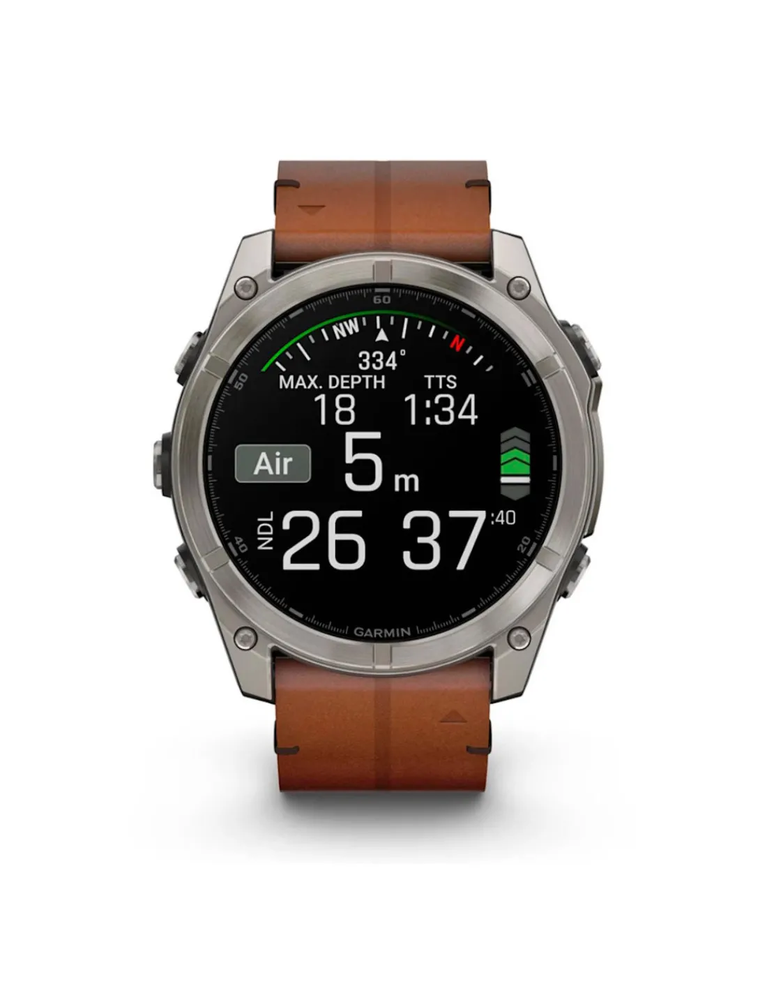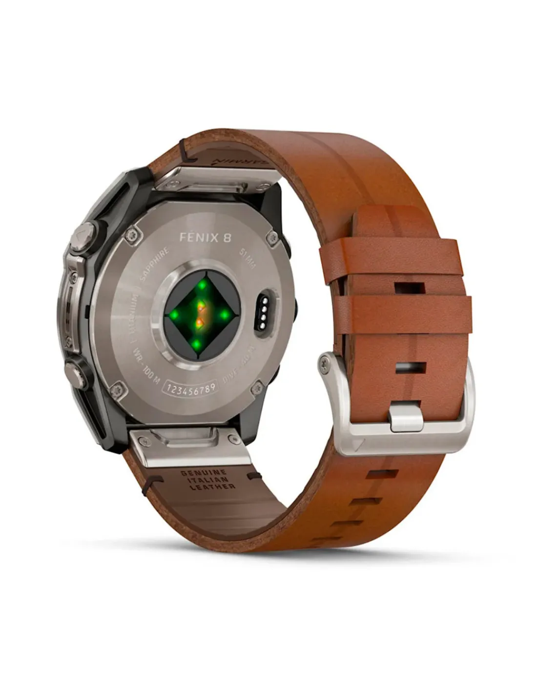 Reloj Garmin Fenix 8 010-02905-40 con carcasa de polímero reforzado con fibra con cubierta posterior de metal de 51 mm y bisel de titanio, cristal de zafiro y pantalla AMOLED nítida y brillante combinado con correa de cuero marrón.