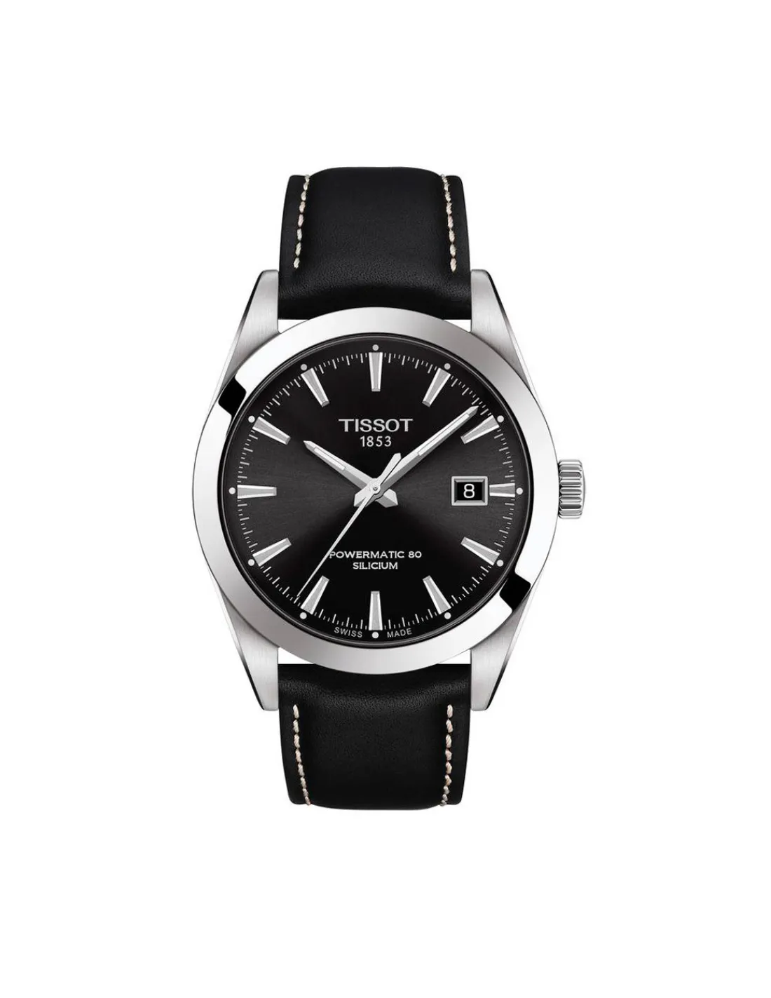 Reloj Tissot Gentleman Powermatic 80 para hombre con caja de acero inoxidable de 40 mm de diámetro, esfera negra con índices Superluminova y correa de piel color negra con pespuntes blancos. Movimiento automático Swiss Made con 80 horas de reserva de marcha.