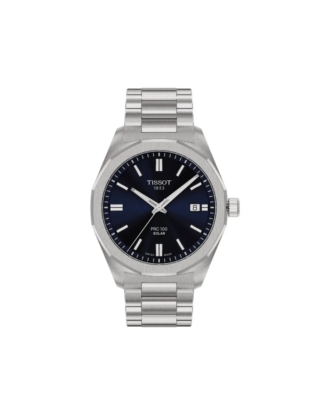 Reloj Tissot PRC 100 con caja de acero inoxidable de 39 mm de diámetro, cristal de zafiro abombado resistente a los arañazos con tratamiento antirreflejos, esfera azul con agujas e índices SuperLuminova combinado con brazalete de acero. Movimiento de cuarzo solar Swiss Made.