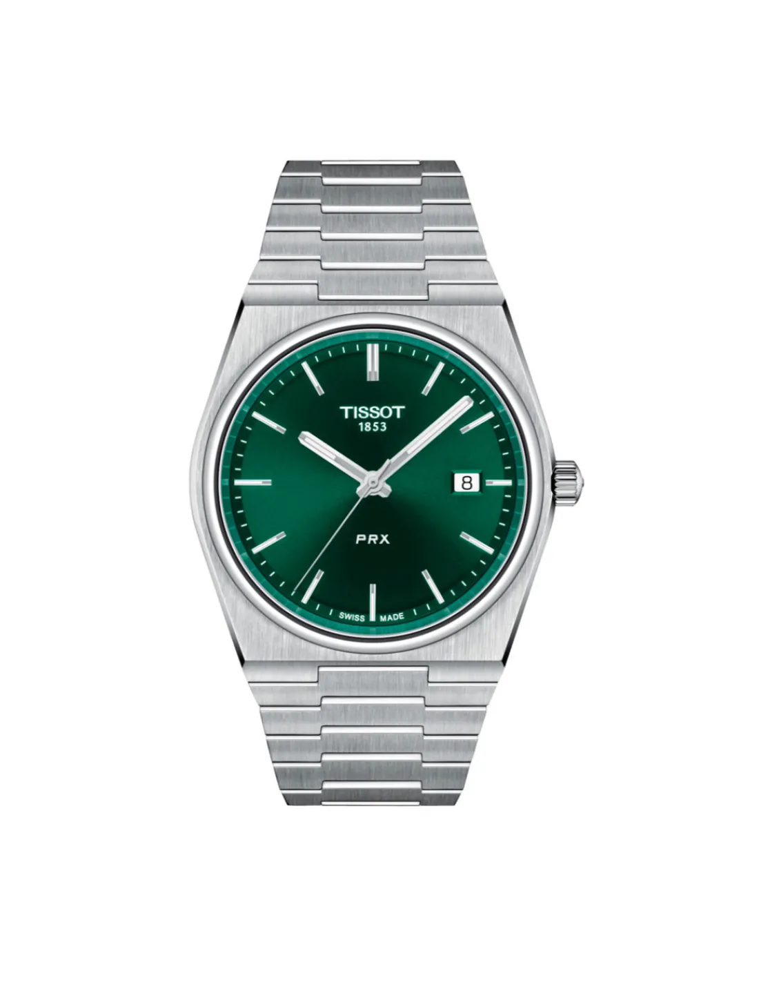 Reloj Tissot PRX T137.410.11.091.00 para hombre con caja y brazalete de acero integrados, esfera verde con índices y agujas agujas luminiscentes y brazalete. Movimiento de cuarzo Swiss Made.